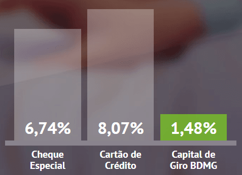 *Cartão de credito e cheque especial, taxas médias, obtidas em 18/08/22, site do Banco Central, seção Estatísticas, Taxas de Juros, PF, pré-fixadas. Capital de Giro BDMG, produto PRONAMPE, taxa a partir de 1,48% a.m., sujeita a análise de risco e crédito.